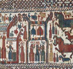 Textile works from the Middle Ages are kept in the Textile Chamber. The objects are mostly textiles used in churches or by priests and bishops. The oldest and most noted object is a 13th-century tapestry from Skog Church, the Skog tapestry. It was found in 1912, wrapped around a bridal crown.[22] Another tapestry is the Grödinge tapestry.[23]