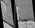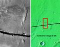 Two views of the Hephaestus Fossae, as seen by HiRISE (picture on right lies to the top (north) of other picture). Fossae often form by material moving into an underground void.