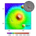 Colorized topographic map of Elysium and its surroundings, from the MOLA instrument of Mars Global Surveyor. The shield volcano Elysium Mons is at center, with the smaller volcanoes Hecates Tholus and Albor Tholus to its upper and lower right, respectively.