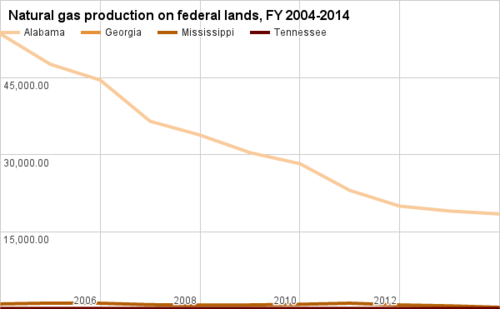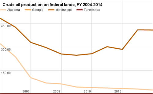 The Office of Natural Resources Revenue (ONRR) provides data on mineral production on federal lands. The charts and tables below show federal onshore oil and natural gas production (in terms of the amounts sold) for fiscal years 2004 to 2014 for Alabama, its adjacent states (provided for comparison), and the United States as a whole.[22]