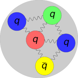 - ↑ Aaij, R., et al. (LHCb collaboration) (2015). "Observation of J/ψp resonances consistent with pentaquark states in Λ0b→J/ψK−p decays". Physical Review Letters 115 (7): 072001. doi:10.1103/PhysRevLett.115.072001. PMID 26317714. Bibcode: 2015PhRvL.115g2001A.0b→J/ψK−p+decays&rft.jtitle=[[Physics:Physical+Review+Letters|Physical+Review+Letters]]&rft.aulast=Aaij&rft.aufirst=R.,+et+al.+(LHCb+collaboration)&rft.au=Aaij, R.,+et+al.+(LHCb+collaboration)&rft.date=2015&rft.volume=115&rft.issue=7&rft.pages=072001&rft_id=info:doi/10.1103/PhysRevLett.115.072001&rft_id=info:pmid/26317714&rft_id=info:bibcode/2015PhRvL.115g2001A&rfr_id=info:sid/en.wikibooks.org:Physics:Exotic_hadron">