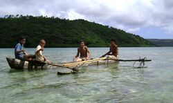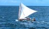 Taumako single-outrigger tepukei, an example of the basic mastless crab claw sail