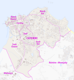 ![]() ![]() ![]() From top to bottom: city center (Place des Palmistes, LCL Bank) and beaches of Cayenne at Anse Montabo. | |