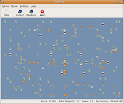 The player can also teleport into a randomly selected location in cases where escape is otherwise impossible. Teleportation counts as a move, and the robots will respond by moving towards the new location. Because the location is randomly selected, it is possible that the player teleports right into the path of a robot. In some versions of the game, there is a "safe teleport" feature which the player may use a limited number of times (for instance once per level) and there may also be a close-range weapon which kills all robots within the immediate vicinity, the use of which would be limited in a similar way.