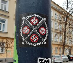 The name and logo of Antifaschistische Aktion remain influential. Its two-flag logo, designed by Max Gebhard (de) and Max Keilson (de), is still widely used as a symbol of militant anti-fascists in Germany and globally,[39] as is the Iron Front's Three Arrows logo.[40]