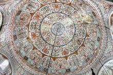 The Et'hem Bey Mosque is located next to the Clock Tower and was started to built in 18th century by Molla Bey and finished in 1819 by his son Haxhi Ethem Bey, grand-grandson of Sulejman Pasha. The mosque was closed during the communist regime in Albania and was reopened as a house of worship after the fall of communism in Albania in 1991, without permission from the authorities. However, the mosque is composed by a prayer hall, a portico that surrounds it from the east and north also the minaret. On the north part of the mosque, there is the entrance to the prayer hall located, which is squared plan and is constructed in a unique volume. It is covered with a dome. The dome is semi-spherical, without windows. The frescoes of the mosque depict trees, waterfalls and bridges. Still life is very rare in the Islamic art. For tourists, the mosque is open outside of the time of prayer. The Khawaja (Albanian: Hoxha) leads visitors to the minaret.