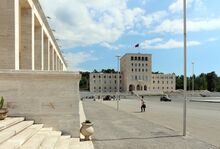 The building encloses the Skanderbeg square in the north-west. The façade is characterized by a large mosaic named The Albanians. The mosaic interprets the history of the Albanians, from the antiquity up to the modern period, as an ongoing struggle against everything. The figures are shown from the left, Illyrian warriors, warriors against the Ottoman Empire, Naim Frashëri, fighters from the National Renaissance, a communist worker, Mother Albania in form of a young woman in a crowd with a gun as the central figure of the composition and five communist partisans of both sexes from the Second World War on the right.[4]