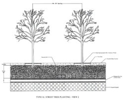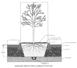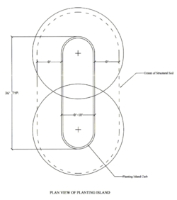 Structural soil is composed of crushed stone (typically limestone or granite) narrowly graded from ¾-1 ½” highly angular with no fines, clay loam which should conform to the USDA soil classification system. The hydrogel is added in a small amount to prevent the separation of the stone and soil during mixing and installation. Usually a layer of stone is spread, then the dry hydrogel is spread evenly on top and screened moist loam is placed on top. The entire mixture is then turned until a uniform blend is produced. Structural soil is not typically stockpiled; it should be mixed and installed soon after delivery. If a stockpile is required, the soil needs to be protected from the elements so it does not become contaminated. Installation typically calls for two cubic feet of soil is needed for every square foot of crown projected. It is also recommended for irrigated trees to have a low-volume drip irrigation. Cornell also suggests a minimum of 24” to 36” for CU-Structural Soil depth and they have established no minimum for length and width of installation, however, because it is a structural soil it was designed to go under the entire pavement area. Testing has shown that structural soil is safe around utilities and that you can use trees from any production system such as balled-and-bur lapped, bare root, containerized and boxed trees.[1][4][5]