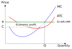 In microeconomics, marginal profit is the increment to profit resulting from a unit or infinitesimal increment to the quantity of a product produced. Under the marginal approach to profit maximization, to maximize profits, a firm should continue to produce a good or service up to the point where marginal profit is zero. At any lesser quantity of output, marginal profit is positive and so profit can be increased by producing a greater amount; likewise, at any quantity of output greater than the one at which marginal profit equals zero, marginal profit is negative and so profit could be made higher by producing less.