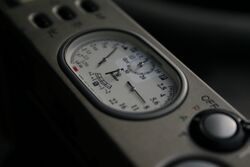 The top panel has a combination analog gauge display that indicates the focusing distance (left), aperture (right), frame number (top), and exposure compensation (bottom). A collar around the shutter release switches the metering mode from (P)rogram to (A)perture-priority and manual (T)ime exposure. A thumbwheel for the right hand, located behind the shutter release on the top deck, allows selection of focus distance in manual focus mode, aperture in aperture-priority autoexposure, or program shift.[1]