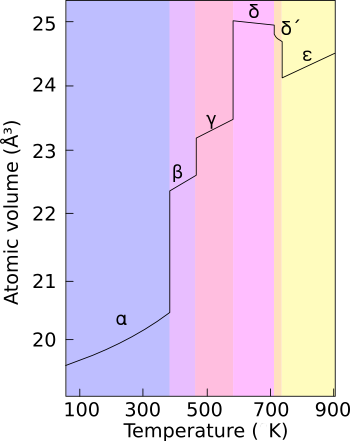 Plutonium normally has six allotropes and forms a seventh (zeta, ζ) under high temperature and a limited pressure range.[1] These allotropes have very similar energy levels but significantly varying densities and crystal structures. This makes plutonium very sensitive to changes in temperature, pressure, or chemistry, and allows for dramatic volume changes following phase transitions.[2] Unlike most materials, plutonium increases in density when it melts, by 2.5%, but the liquid metal exhibits a linear decrease in density with temperature.[3] Densities of the different allotropes vary from 16.00 g/cm3 to 19.86 g/cm3.