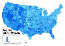 Rural and urban areas show differences as well. "The suicide rate is nearly twice as great in the most rural areas of the U.S. compared to the most urban areas (18.9 per 100,000 people in rural areas vs. 13.2 per 100,000 people in urban areas)."[12] This could be due to a number of factors such as physical isolation,[13] limited access to mental health services,[14] increased access to lethal means[15] or stigma regarding mental health.[16]