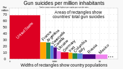 The US has had the largest number of gun-related suicides in the world every year from 1990 through at least 2019.[44] With 4% of the world's population, the US had 44% of global gun suicides in 2019, and the highest rate per capita.[44]