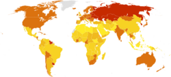 In 2003 in the United States, Whites and Asians were nearly 2.5 times more likely to kill themselves than Blacks or Mexicans.[22] In the eastern portion of the world (primarily in Asian and Pacific-Island countries), the numbers of reported suicides are growing every year.[23]