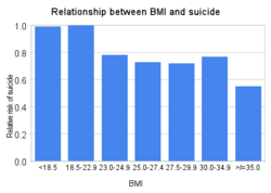↑"Body Mass Index and Risk of Suicide Among One Million US Adults". Epidemiology21 (1): 82–6. November 2009. doi:10.1097/EDE.0b013e3181c1fa2d. PMID 19907331.