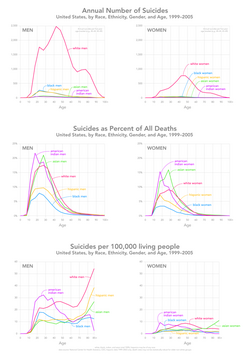 U.S. Suicides by age, gender, and racial or ethnic group, 1999–2005. Data from the CDC.[18] Racial and ethnic groups defined by the U.S. Office of Management and Budget.