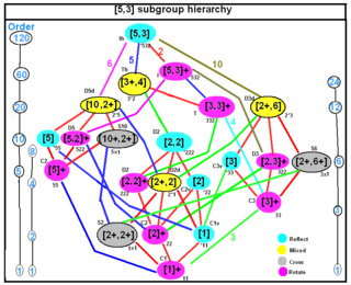 ) of order 120 has generators represented by the reflection matrices R0, R1, R2 below, with relations R02 = R12 = R22 = (R0×R1)5 = (R1×R2)3 = (R0×R2)2 = Identity. The group [5,3]+ (![]()