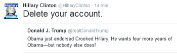The 2016 U.S. Presidential Election took place on November 8, 2016, finally putting to rest fears[3] that President Obama is a commie-Muslim King doing everything possible to further rob the GOP base of their few remaining freedoms and usher in Sharia law before Hillary replaces it with Halakha.[4] Her opponent was Donald J. Trump, an unwitting hero to the thousands of Americans that enjoy writing "y dos EVERYTHING hav to BE abot RACE!??!!" in the comments section of every Yahoo article.