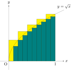 As another example, to find the area of the region bounded by the graph of the function f(x) = [math]\displaystyle{ \sqrt{x} }[/math] between x = 0 and x = 1, one can divide the interval into five pieces (0, 1/5, 2/5, ..., 1), then construct rectangle2 using the right end height of each piece (thus √0, √1/5, √2/5, ..., √1) and sum their areas to get the approximation