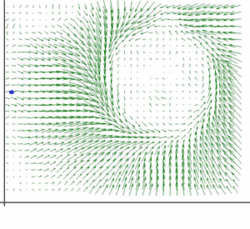 For an example of applications of surface integrals, consider a vector field v on a surface S; that is, for each point x in S, v(x) is a vector. Imagine that a fluid flows through S, such that v(x) determines the velocity of the fluid at x. The flux is defined as the quantity of fluid flowing through S in unit amount of time. To find the flux, one need to take the dot product of v with the unit surface normal to S at each point, which will give a scalar field, which is integrated over the surface:[46]