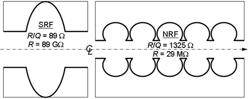 The complex calculations treating wakefield-related beam stability for the TM010 mode in accelerators show that there are specific regions of phase between the beam bunches and the driven RF mode that allow stable operation at the highest possible beam currents. At some point of increasing beam current, though, just about any accelerator configuration will become unstable. As pointed out above, the beam wakefield amplitude is proportional to the cavity parameter R/Qo, so this is typically used as a comparative measure of the likelihood of TM01 related beam instabilities. A comparison of R/Qo and R for a 500 MHz superconducting cavity and a 500 MHz normal-conducting cavity is shown below. The accelerating voltage provided by both cavities is comparable for a given net power consumption when including refrigeration power for SRF. The R/Qo for the SRF cavity is 15 times less than the normal-conducting version, and thus less beam-instability susceptible. This one of the main reasons such SRF cavities are chosen for use in high-current storage rings.