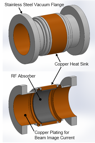 The resistive load for HOMs can be implemented by having loop antennas located at apertures on the side of the beampipe, with coaxial lines routing the RF to outside of the cryostat to standard RF loads. Another approach is to place the HOM loads directly on the beampipe as hollow cylinders with RF lossy material attached to the interior surface, as shown in the adjacent image. This "beamline load" approach can be more technically challenging, since the load must absorb high RF power while preserving a high-vacuum beamline environment in close proximity to a contamination-sensitive SRF cavity. Further, such loads must sometimes operate at cryogenic temperatures to avoid large thermal gradients along the beampipe from the cold SRF cavity. The benefit of the beamline HOM load configuration, however, is a greater absorptive bandwidth and HOM attenuation as compared to antenna coupling. This benefit can be the difference between a stable vs. an unstable particle beam for high current accelerators.