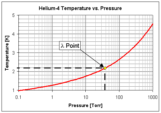The temperature of operation of an SRF cavity is typically selected as a minimization of wall-plug power for the entire SRF system. The plot to the right then shows the pressure to which the helium vessel must be pumped to obtain the desired liquid helium temperature. Atmospheric pressure is 760 Torr (101.325 kPa), corresponding to 4.2 K helium. The superfluid λ point occurs at about 38 Torr (5.1 kPa), corresponding to 2.18 K helium. Most SRF systems either operate at atmospheric pressure, 4.2 K, or below the λ point at a system efficiency optimum usually around 1.8 K, corresponding to about 12 Torr (1.6 kPa).