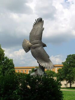 "In High Places," is a 22 ft (6.7 m) tall bronze statue of a flying eagle created by Gerald Balciar and dedicated during the university's centennial in 1990.[78]