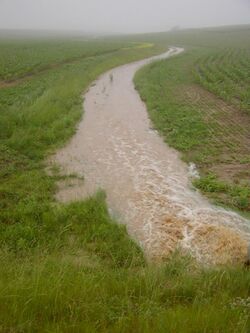 Runoff generated on cropland during storms or long winter rains concentrates in the thalweg where it can lead to rill or gully erosion.