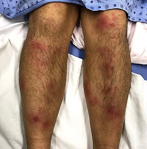 Treatment generally is supportive care including rest and the use of NSAIDs.[1][2] Underlying conditions may need to be addressed.[1] Each lesion may last for two weeks with an attack lasting for up to six weeks.[1] About 1 in 20,000 to 100,000 people are affected.[1] Females are affected six time more frequently than males.[1] It is most common in the 20 to 40 year age group.[1][2] It was first described in English in 1807 by Robert Willan.[4]