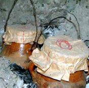 Surrounded by lemon, orange, and olive groves, the city's culinary characteristics are rich and heavily spiced but not hot, using various preparations of Ras el hanout (which means "Head of the shop"), a blend of dozens of spices which include ash berries, chilli, cinnamon, grains of paradise, monk's pepper, nutmeg, and turmeric.[219] A specialty of the city and the symbol of its cuisine is tanjia marrakshia, affectionately referred to as bint ar-rimad (بنت الرماد "daughter of the ash"), a local meal prepared with beef meat, spices, and smen and slow-cooked in a ceramic pot in traditional oven in hot ashes.[220] Tajines can be prepared with chicken, lamb, beef or fish, adding fruit, olives and preserved lemon, vegetables and spices, including cumin, peppers, saffron, turmeric, and ras el hanout. The meal is prepared in a tajine pot and slow-cooked with steam. Another version of tajine includes vegetables and chickpeas seasoned with flower petals.[221] Tajines may also be basted with "smen" Moroccan ghee that has a flavour similar to blue cheese.[222]