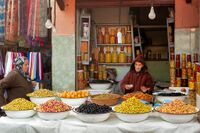 One of the largest souks is Souk Semmarine, which sells everything from brightly coloured bejewelled sandals and slippers and leather pouffes to jewellery and kaftans.[123] Souk Ableuh contains stalls which specialize in lemons, chilis, capers, pickles, green, red, and black olives, and mint, a common ingredient of Moroccan cuisine and tea. Similarly, Souk Kchacha specializes in dried fruit and nuts, including dates, figs, walnuts, cashews and apricots.[124] Rahba Qedima contains stalls selling hand-woven baskets, natural perfumes, knitted hats, scarves, tee shirts, Ramadan tea, ginseng, and alligator and iguana skins. The Criée Berbère, to the northeast of this market, is noted for its dark Berber carpets and rugs.[123] Souk Siyyaghin is known for its jewellery, and Souk Smata nearby is noted for its extensive collection of babouches and belts. Souk Cherratine specializes in leatherware, and Souk Belaarif sells modern consumer goods.[122] Souk Haddadine specializes in ironware and lanterns.[125] The Medina is also famous for its street food. Mechoui Alley is particularly famous for selling slow-roasted lamb dishes.[126] The Ensemble Artisanal, located near the Koutoubia Mosque, is a government-run complex of small arts and crafts which offers a range of leather goods, textiles and carpets. Young apprentices are taught a range of crafts in the workshop at the back of this complex.[127]