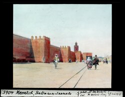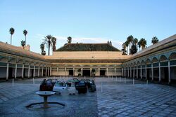 The Mellah of Marrakesh is the old Jewish Quarter (Mellah) of the city, and is located in the kasbah area of the city's medina, east of Place des Ferblantiers. It was created in 1558 by the Saadians at the site where the sultan's stables were.[168] At the time, the Jewish community consisted of a large portion of the city's tailors, metalworkers, bankers, jewelers, and sugar traders. During the 16th century, the Mellah had its own fountains, gardens, synagogues and souks. Until the arrival of the French in 1912, Jews could not own property outside of the Mellah; all growth was consequently contained within the limits of the neighborhood, resulting in narrow streets, small shops and higher residential buildings. The Mellah, today reconfigured as a mainly residential zone renamed Hay Essalam, currently occupies an area smaller than its historic limits and has an almost entirely Muslim population. The Slat al-Azama Synagogue (or Lazama Synagogue), built around a central courtyard, is in the Mellah.[169] The Jewish cemetery here is the largest of its kind in Morocco. Characterized by white-washed tombs and sandy graves,[169] the cemetery is within the Medina on land adjacent to the Mellah.[170] According to the World Jewish Congress there were only 250 Moroccan Jews remaining in Marrakesh.[171]