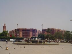 The Jemaa el-Fnaa is one of the best-known squares in Africa and is the centre of city activity and trade. It has been described as a "world-famous square", "a metaphorical urban icon, a bridge between the past and the present, the place where (spectacularized) Moroccan tradition encounters modernity."[113] It has been part of the UNESCO World Heritage site since 1985.[114] The square's name has several possible meanings; the most plausible etymology endorsed by historians is that it meant "ruined mosque" or "mosque of annihilation", referring to the construction of a mosque within the square in the late 16th century that was left unfinished and fell into ruin.[115][116][117] The square was originally an open space for markets located on the east side of the Ksar el-Hajjar, the main fortress and palace of the Almoravid dynasty who founded Marrakesh.[20][50] Following the takeover of the city by the Almohads, a new royal palace complex was founded to the south of the city (the Kasbah) and the old Almoravid palace was abandoned, but the market square remained. Subsequently, with the fluctuating fortunes of the city, Jemaa el-Fnaa saw periods of decline and renewal.[118]