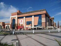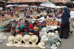 Trade and crafts are extremely important to the local tourism-fueled economy. There are 18 souks in Marrakesh, employing over 40,000 people in pottery, copperware, leather and other crafts. The souks contain a massive range of items from plastic sandals to Palestinian-style scarves imported from India or China. Local boutiques are adept at making western-style clothes using Moroccan materials.[91] The Birmingham Post comments: "The souk offers an incredible shopping experience with a myriad of narrow winding streets that lead through a series of smaller markets clustered by trade. Through the squawking chaos of the poultry market, the gory fascination of the open-air butchers' shops and the uncountable number of small and specialist traders, just wandering around the streets can pass an entire day."[89] Marrakesh has several supermarkets including Marjane Acima, Asswak Salam and Carrefour, and three major shopping centres, Al Mazar Mall, Plaza Marrakech and Marjane Square; a branch of Carrefour opened in Al Mazar Mall in 2010.[99][100] Industrial production in the city is centred in the neighbourhood of Sidi Ghanem Al Massar, containing large factories, workshops, storage depots and showrooms. Ciments Morocco, a subsidiary of a major Italian cement firm, has a factory in Marrakech.[101] The AeroExpo Marrakech International Exhibition of aeronautical industries and services is held here, as is the Riad Art Expo.
