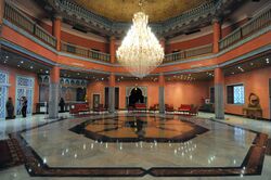 The Marrakech Museum, housed in the Dar Menebhi Palace in the old city centre, was built at the beginning of the 20th century by Mehdi Menebhi.[179][180] The palace was carefully restored by the Omar Benjelloun Foundation and converted into a museum in 1997.[181] The house itself represents an example of classical Andalusian architecture, with fountains in the central courtyard, traditional seating areas, a hammam and intricate tilework and carvings.[182] It has been cited as having "an orgy of stalactite stucco-work" which "drips from the ceiling and combines with a mind-boggling excess of zellij work."[182] The museum holds exhibits of both modern and traditional Moroccan art together with fine examples of historical books, coins and pottery produced by Moroccan Jewish, Berber and Arab peoples.[183][184]