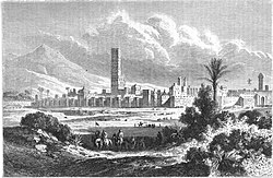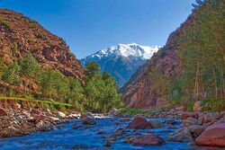 The city is located in the Tensift River valley,[72] with the Tensift River passing along the northern edge of the city. The Ourika River valley is about 30 kilometres (19 mi) south of Marrakesh.[73] The "silvery valley of the Ourika river curving north towards Marrakesh", and the "red heights of Jebel Yagour still capped with snow" to the south are sights in this area.[74] David Prescott Barrows, who describes Marrakesh as Morocco's "strangest city", describes the landscape in the following terms: "The city lies some fifteen or twenty miles [25–30 km] from the foot of the Atlas mountains, which here rise to their grandest proportions. The spectacle of the mountains is superb. Through the clear desert air the eye can follow the rugged contours of the range for great distances to the north and eastward. The winter snows mantle them with white, and the turquoise sky gives a setting for their grey rocks and gleaming caps that is of unrivaled beauty."[54]