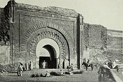 Of the city's gates, one of the best-known is Bab Agnaou, built in the late 12th century by the Almohad caliph Ya'qub al-Mansur as the main public entrance to the new Kasbah.[129][130] The Berber name Agnaou, like Gnaoua, refers to people of Sub-Saharan African origin (cf. Akal-n-iguinawen – land of the black). The gate was called Bab al Kohl (the word kohl also meaning "black") or Bab al Qsar (palace gate) in some historical sources.[131] The corner-pieces are embellished with floral decorations. This ornamentation is framed by three panels marked with an inscription from the Quran in Maghrebi script using foliated Kufic letters, which were also used in Al-Andalus. Bab Agnaou was renovated and its opening reduced in size during the rule of sultan Mohammed ben Abdallah.[132]