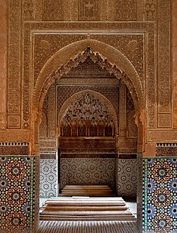 One of the most famous funerary monuments in the city is the Saadian Tombs, which were built in the 16th century as a royal necropolis for the Saadian Dynasty. It is located next to the south wall of the Kasbah Mosque. The necropolis contains the tombs of many Saadian rulers including Muhammad al-Shaykh, Abdallah al-Ghalib, and Ahmad al-Mansur, as well as various family members and later sultans.[157] It consists of two main structures, each with several rooms, standing within a garden enclosure. The most important graves are marked by horizontal tombstones of finely carved marble, while others are merely covered in colorful zellij tiles. Al-Mansur's mausoleum chamber is especially rich in decoration, with a roof of carved and painted cedar wood supported on twelve columns of carrara marble, and with walls decorated with geometric patterns in zellij tilework and vegetal motifs in carved stucco. The chamber next to it, originally a prayer room equipped with a mihrab, was later repurposed as a mausoleum for members of the Alaouite dynasty.[157][163]