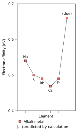 Although francium is the heaviest alkali metal that has been discovered, there has been some theoretical work predicting the physical and chemical characteristics of hypothetical heavier alkali metals. Being the first period 8 element, the undiscovered element ununennium (element 119) is predicted to be the next alkali metal after francium and behave much like their lighter congeners; however, it is also predicted to differ from the lighter alkali metals in some properties.[37]:1729–1730 Its chemistry is predicted to be closer to that of potassium[42] or rubidium[37]:1729–1730 instead of caesium or francium. This is unusual as periodic trends, ignoring relativistic effects would predict ununennium to be even more reactive than caesium and francium. This lowered reactivity is due to the relativistic stabilisation of ununennium's valence electron, increasing ununennium's first ionisation energy and decreasing the metallic and ionic radii;[42] this effect is already seen for francium.[37]:1729–1730 This assumes that ununennium will behave chemically as an alkali metal, which, although likely, may not be true due to relativistic effects.[147] The relativistic stabilisation of the 8s orbital also increases ununennium's electron affinity far beyond that of caesium and francium; indeed, ununennium is expected to have an electron affinity higher than all the alkali metals lighter than it. Relativistic effects also cause a very large drop in the polarisability of ununennium.[37]:1729–1730 On the other hand, ununennium is predicted to continue the trend of melting points decreasing going down the group, being expected to have a melting point between 0 °C and 30 °C.[37]:1724