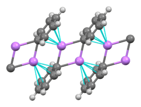 Unlike the organolithium compounds, the organometallic compounds of the heavier alkali metals are predominantly ionic. The application of organosodium compounds in chemistry is limited in part due to competition from organolithium compounds, which are commercially available and exhibit more convenient reactivity. The principal organosodium compound of commercial importance is sodium cyclopentadienide. Sodium tetraphenylborate can also be classified as an organosodium compound since in the solid state sodium is bound to the aryl groups. Organometallic compounds of the higher alkali metals are even more reactive than organosodium compounds and of limited utility. A notable reagent is Schlosser's base, a mixture of n-butyllithium and potassium tert-butoxide. This reagent reacts with propene to form the compound allylpotassium (KCH2CHCH2). cis-2-Butene and trans-2-butene equilibrate when in contact with alkali metals. Whereas isomerisation is fast with lithium and sodium, it is slow with the heavier alkali metals. The heavier alkali metals also favour the sterically congested conformation.[140] Several crystal structures of organopotassium compounds have been reported, establishing that they, like the sodium compounds, are polymeric.[141] Organosodium, organopotassium, organorubidium and organocaesium compounds are all mostly ionic and are insoluble (or nearly so) in nonpolar solvents.[66]