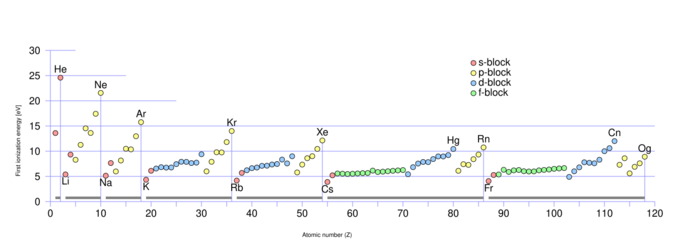 | First ionisation energy (kJ·mol−1) | 520.2 | 495.8 | 418.8 | 403.0 | 375.7 | 392.8[68] |