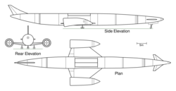 In 2016 AFRL released two TSTO concepts using SABRE in the first stage: The first 150 feet (46 m) long carrying an expendable upper stage in an underside opening cargo bay capable of delivering around 5,000 pounds (2,300 kg; 2.3 t) to an orbit of 100 nautical miles (190 km), the second 190 feet (58 m) long carrying a reusable spaceplane on its back, capable of delivering around 20,000 pounds (9,100 kg; 9.1 t) to an orbit of 100 nautical miles (190 km).[12]