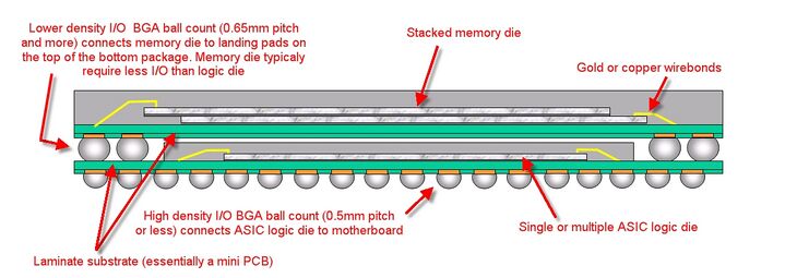 Mixed logic-memory stacking: logic (CPU) package on the bottom, memory package on top. For example, the bottom could be a system on a chip (SoC) for a mobile phone. The logic package is on the bottom because it needs many more BGA connections to the motherboard.