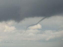 A funnel cloud is a funnel-shaped cloud of condensed water droplets, associated with a rotating column of wind and extending from the base of a cloud (usually a cumulonimbus or towering cumulus cloud) but not reaching the ground or a water surface.[1] A funnel cloud is usually visible as a cone-shaped or needle like protuberance from the main cloud base. Funnel clouds form most frequently in association with supercell thunderstorms, and are often, but not always, a visual precursor to tornadoes. Funnel clouds are visual phenomena, these are not the vortex of wind itself.[2]