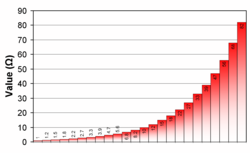 In 1870 Charles Renard proposed a set of preferred numbers.[2] His system was adopted in 1952 as international standard ISO 3.[3] Renard's system divides the interval from 1 to 10 into 5, 10, 20, or 40 steps, leading to the R5, R10, R20 and R40 scales, respectively. The factor between two consecutive numbers in a Renard series is approximately constant (before rounding), namely the 5th, 10th, 20th, or 40th root of 10 (approximately 1.58, 1.26, 1.12, and 1.06, respectively), which leads to a geometric sequence. This way, the maximum relative error is minimized if an arbitrary number is replaced by the nearest Renard number multiplied by the appropriate power of 10. Example: 1.0, 1.6, 2.5, 4.0, 6.3