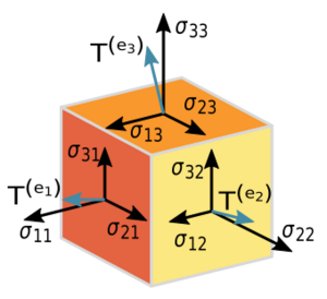 Important examples are provided by continuum mechanics. The stresses inside a solid body or fluid[28] are described by a tensor field. The stress tensor and strain tensor are both second-order tensor fields, and are related in a general linear elastic material by a fourth-order elasticity tensor field. In detail, the tensor quantifying stress in a 3-dimensional solid object has components that can be conveniently represented as a 3 × 3 array. The three faces of a cube-shaped infinitesimal volume segment of the solid are each subject to some given force. The force's vector components are also three in number. Thus, 3 × 3, or 9 components are required to describe the stress at this cube-shaped infinitesimal segment. Within the bounds of this solid is a whole mass of varying stress quantities, each requiring 9 quantities to describe. Thus, a second-order tensor is needed.