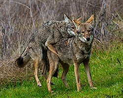 No significant differences exist between eastern and western coyotes in aggression and fighting, though eastern coyotes tend to fight less, and are more playful. Unlike western coyote pups, in which fighting precedes play behavior, fighting among eastern coyote pups occurs after the onset of play.[80] Eastern coyotes tend to reach sexual maturity at two years of age, much later than in western coyotes.[78]