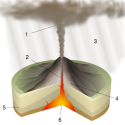 Diagram of a Plinian eruption. (key: 1. Ash plume; 2. Magma conduit; 3. Volcanic ash rain; 4. Layers of lava and ash; 5. Stratum; 6. Magma chamber)