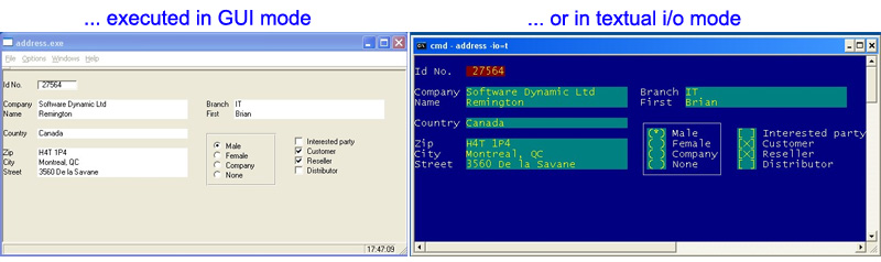 Visual FlagShip makes a GUI-based application from textual xBase code which can then be modified using object-oriented programming or procedural programming.[1] The same source and the same application supports GUI, textual and stream mode (e.g. for Web or background). The i/o mode is either detected automatically from the current environment (heterogenal application), or can be specified at compile time or at run-time using command-line switch.